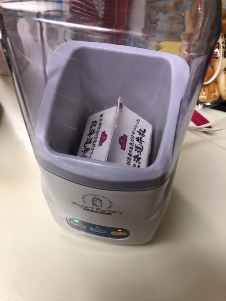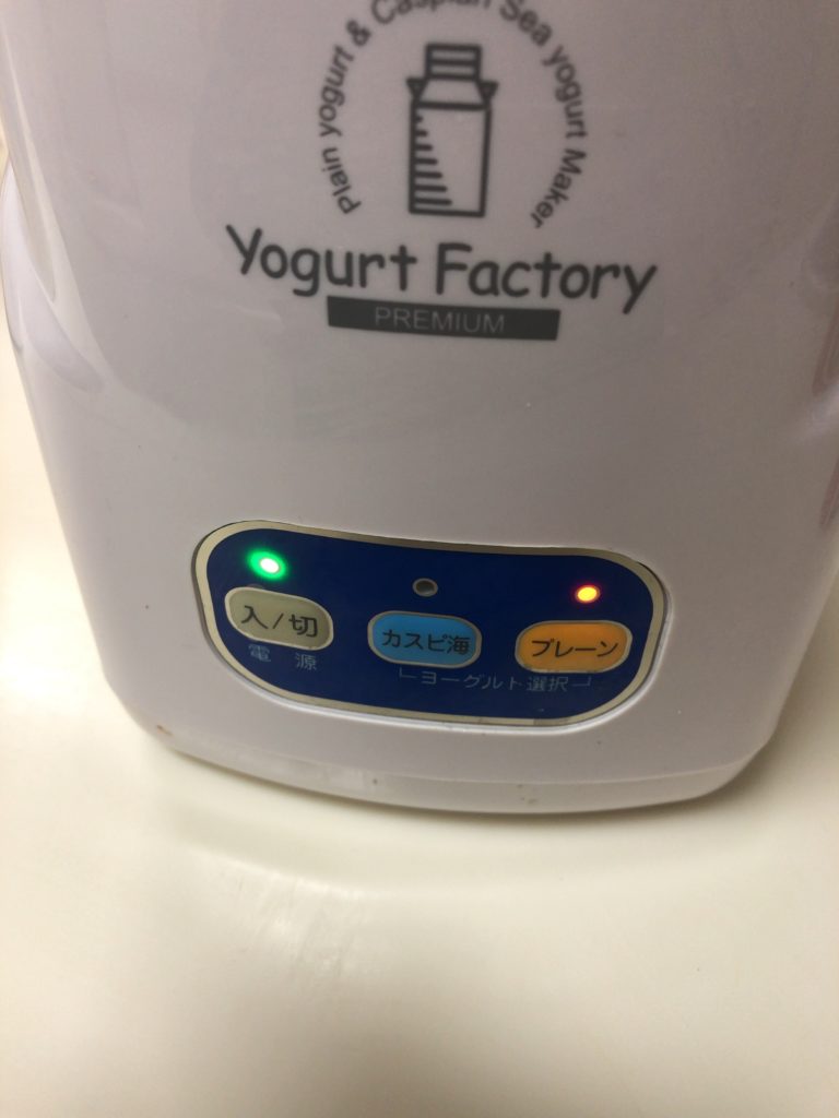 ヨーグルトメーカーに牛乳パックを入れて、「入/切」ボタン、「プレーン」ボタンを押します。